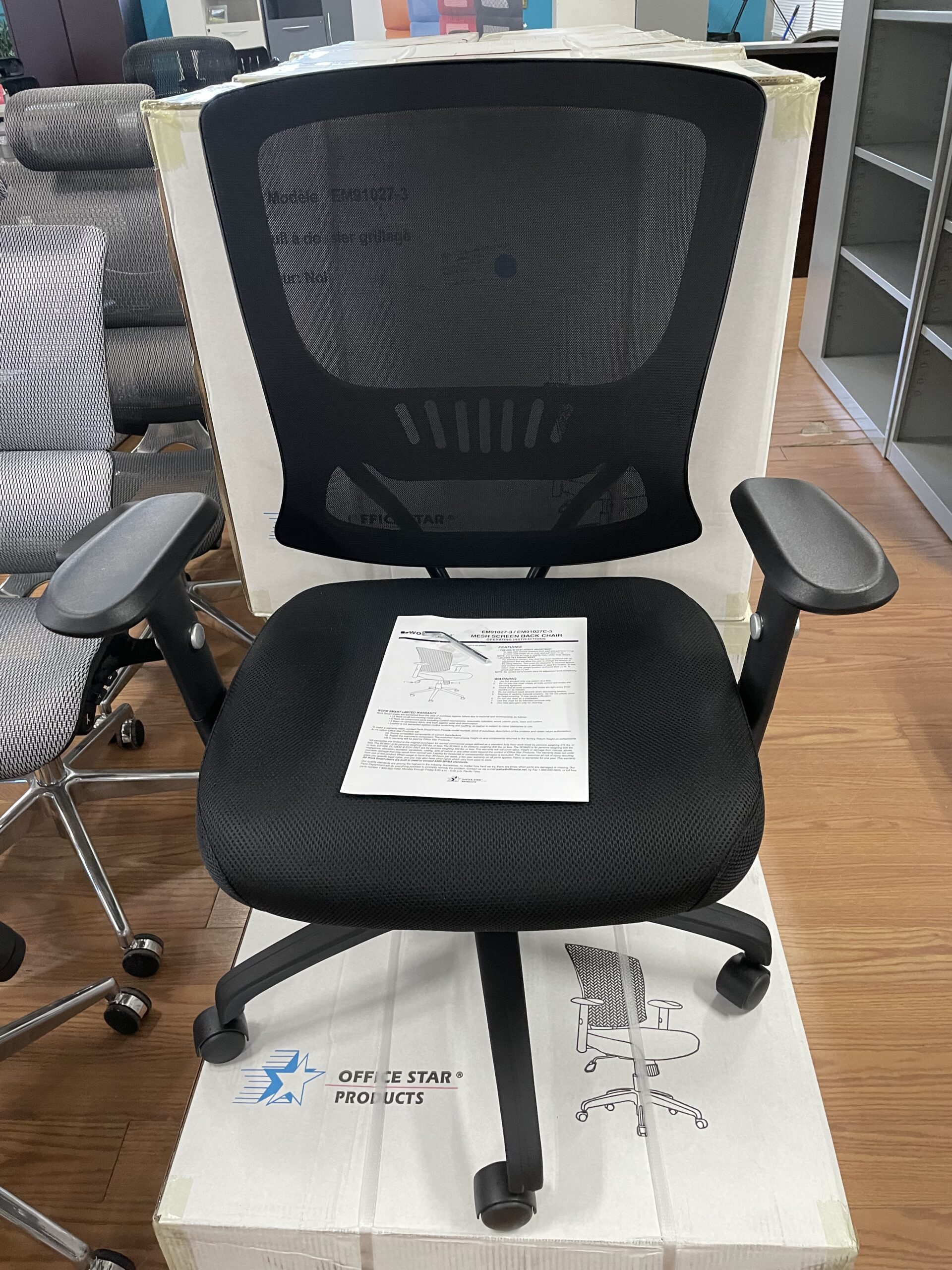 Just in ! New Office star task chairs.Features mesh back and contoured foam filled seat panel with black metal back support bars and resin plastic base . Standard casters and PU arms . Back tilt feature and great look for around a conference table. 12-Available! Each on sale at $349.99 plus hst each! Comes boxed -Easy assembly or just $18.99 for assembly per chair!