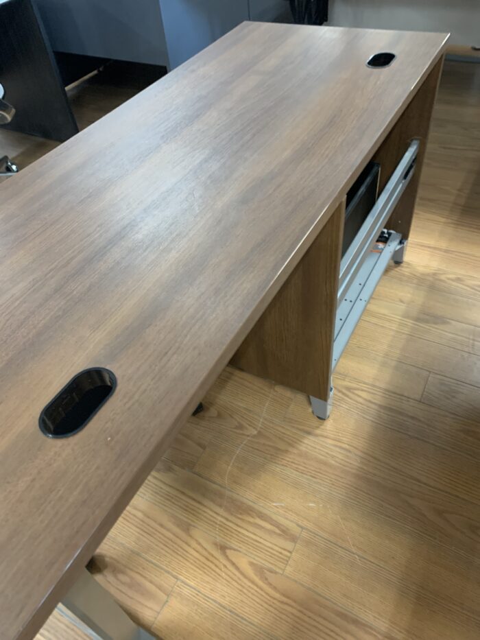 Used Laminate Desk with surface area of 24″ x 60″ and tri-level file drawers and alloy legs. Dark oak colour. Cable cutout in the top. Best placed against a wall given back side of drawers (back panel) is open . (See photo 3)