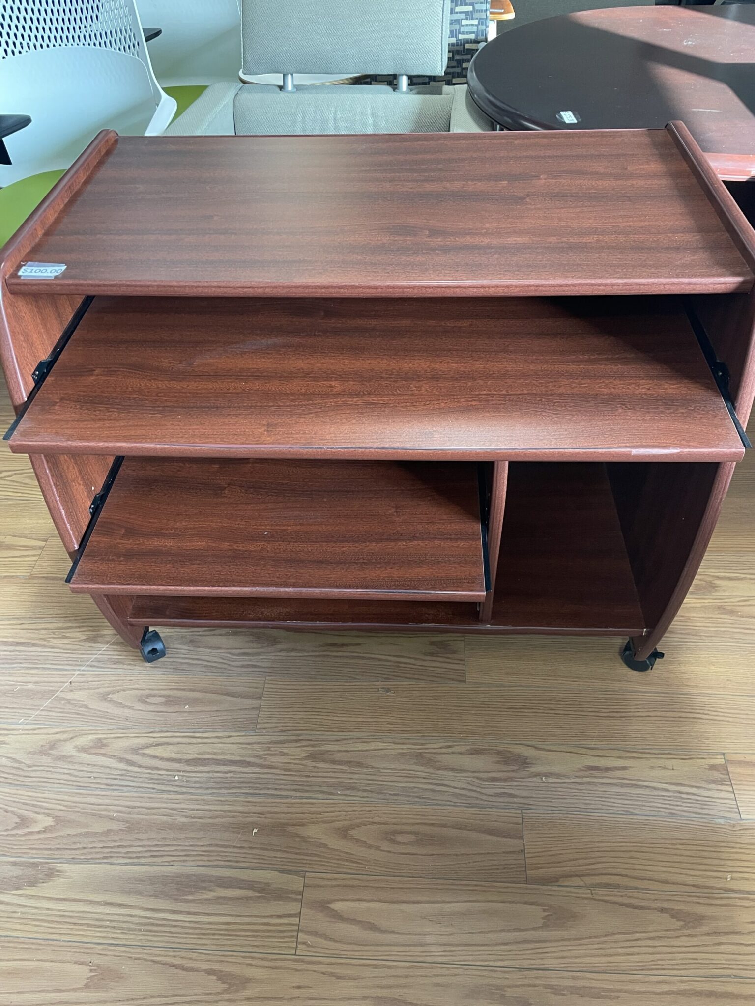 Used mahogany coloured laminate rolling desk unit with pull out keyboard and lower shelf. 37″ tall sides with work surface of 20″ x 32″ on casters. Great value at $100.00 plus hst~